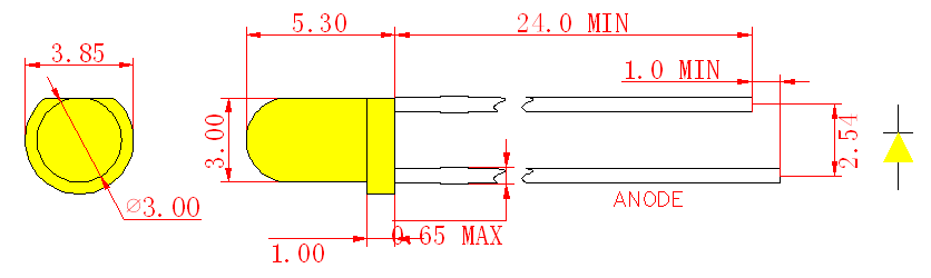 3mm 黄色丸型 LED ランプ(LL30UY3D60-200)